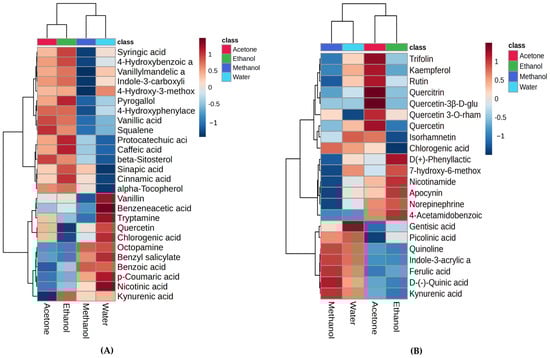 Hierarchical cluster heatmaps of tentatively identified phytochemicals in different L. shawii extracts based on ANOVA using (A) GC-MS; (B) combined UHPLC-ESI-MS (+/−) data. The heatmaps show the average of extract group replicates in the rows and metabolite features in the columns. The color indicates the average concentration of each metabolite, from low (blue) to high (red).