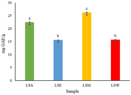 Figure 9 shows an estimate of the total phenolic content (TPC) of different solvent extracts of L. shawii as determined by the Folin–Ciocalteu method. The highest TPC of L. shawii was found in LSM (26.265 ± 0.005 mg GAE/g), followed by LSA (22.50 ± 0.06 mg GAE/g), LSW (15.73 ± 0.02 mg GAE/g), and lastly LSE (15.65 ± 0.01 mg GAE/g). No significant differences (p > 0.05) were found between LSE and LSW, indicating that these solvents are similarly efficient at extracting the phenolic compounds present in L. shawii.