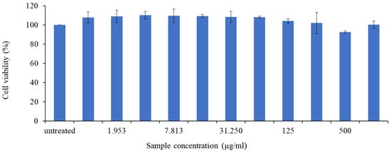 The cytotoxicity assessment was performed using an MTT assay based on previous research [32], with slight modification. The RAW 264.7 cells were seeded in 96-well plates at a density of 2.0 × 104 cells followed by 24 h incubation and then treated with 11 ranges of LSW extract concentrations (0.977–1000 µg/mL) for another 24 h. Viability or cytotoxic assay on RAW 264.7 was carried out to determine the non-toxic concentration of samples in RAW 264.7 cells to establish sample concentration in the nitric oxide (NO) inhibition assay. The medium was discharged, and the cells were washed using phosphate buffer saline (PBS) 1x. After adding 100 µL of a 0.5 mg/mL solution of 3-[4,5-dimethylthiazol-2-yl]-2,5 diphenyl tetrazolium bromide (MTT) into each well, the cells were incubated in incubator with 5% CO2 37 °C for 4 h. To quantify the percentage of viable cells, the cells were exposed to a 100 µL solution containing 10% sodium dodecyl sulphate (SDS) in 0.1 N HCl overnight. The absorbance of the medium was measured at 570 nm using a microplate reader (Synergy HTX; Bio-Tek Instruments Inc., Winooski, VT, USA). Finally, the percentage of cell viability was calculated using the following formula: cell viability (%) = ([Abs of sample/Abs of control] × 100). A graph of cell viability percentage versus log concentration was plotted to determine the IC50 (concentration of the tested sample to reduce cell viability by 50%).