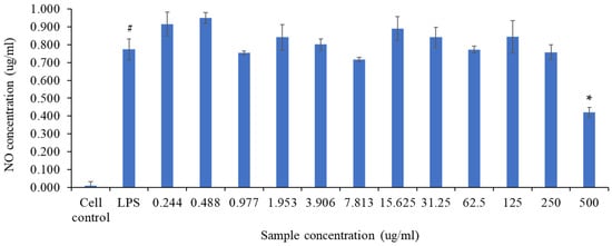 Anti-inflammatory activity was assessed using the inhibition of nitric oxide (NO) assay on RAW 264.7 cells following protocol [34]. NO production was determined using Griess reagent, and NO concentration in each group was quantified using sodium nitrite as a standard. RAW 264.7 cells were seeded into 96-well plates at a density of 10 × 105 and incubated in 100 µL culture medium for 24 h. LSW extract of 12 different concentrations (0.24–500 µg/mL) were added into the cells and incubated for 2 h followed by the addition of 1 µg/mL LPS (lipopolysaccharide) into the RAW 264.7 cells. The cells were then incubated for another 24 h, after which 100 µL Griess reagent (0.1% N-(1-naphthyl)- ethylenediamine and 1% sulfanilamide in 5% phosphoric acid) was added. The mixture was incubated at room temperature for 20 min and then absorbance was measured using a microplate reader (Synergy HTX; Bio-Tek Instruments Inc., Winooski, VT, USA) at wavelength of 540 nm. To show that the sample has anti-inflammatory activity, the NO concentration of cells in the treatment group must be significantly lower than the NO concentration in the LPS-induced cells without treatment.