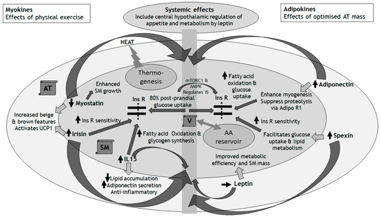 The Adipo–Muscle Axis (AMA). Dotted arrows show paracrine effects of myokines and adipokines on the AT and SM, respectively; solid curved arrows show systemic endocrine effects via the vasculature; and solid straight arrows show effects on Ins R sensitivity, glucose, and amino acid handling within the SM. AA: amino acids; Adipo R1: receptor for adiponectin; AMPK: AMP-activated protein kinase; AT: adipose tissue; IL-15: interleukin-15; Ins R: insulin receptor; IS: insulin signalling; mTORC1: Mammalian Target of Rapamycin Complex 1; SM: skeletal muscle; UCP1: uncoupling protein 1; V: vasculature.