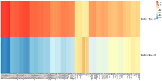The basic characteristics of the subjects and the differences between the clustering groups are shown in Table 1. The mean age of the subjects was 40.2 years, and 34.4% of the men were obese. More than half of the subjects participated in regular exercise (60.9%). Approximately one-third of the men were current smokers, and most of the men were current drinkers. Age and modifiable behavioral factors were not different between clusters 1 and 2. However, BMI was higher in cluster 1 than in cluster 2 (Table 1), and BMI was significantly associated with cluster groups (OR = 0.77, 95% CIs: 0.61–0.98) (Table 2). The heatmap illustrates the normalized metabolite intensities, clearly differentiating the two clusters (Figure 1). Cluster 1 (N = 41) showed distinct metabolic patterns compared to cluster 2 (N = 23), with marked differences observed in phosphatidylcholines and other lipid-related metabolites.