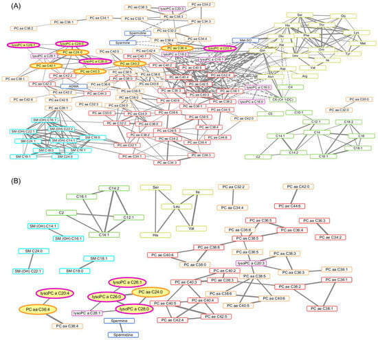 However, lyso-PCs and diacyl-PCs were not placed at the center of the networks, as they did not show high degree or betweenness centrality according to the network analysis (Table 4). Acyl-alkyl-PCs (PC ae C40:3 and PC ae C42:5) showed high degree and betweenness centrality in the network of cluster 1. In the network of cluster 2, leucine showed the highest degree and betweenness centrality (Table 4).