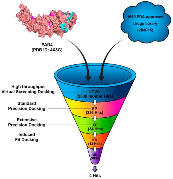 The FDA-approved drugs library was retrieved from the ZINC 15 online server (https://zinc.docking.org/ (accessed on 30 November 2022), a public web-accessible database containing over 750 million purchasable compounds [32]. A total of 1650 compounds were downloaded and saved in the 2D Structure-Data File (SDF) format and imported into Maestro. The chirality and ionization states were optimized at a physiological pH of 7.4 ± 2.0 and were determined with the aid of Epik. During this stage, several treatments were applied to the structures. Finally, the OPLS3 force field was selected to optimize the geometries [33]. The 1650 FDA-approved compounds were subjected to high-throughput virtual screening (HTVS) using Glide software to assess the binding potential to the target protein, PAD4 (PDB ID: 4X8G). A total of 2338 isomer hits were obtained, which were further filtered by Standard Precision (SP) docking. In this more selective docking procedure, 236 compounds were found to have favorable docking scores and plausible binding poses. These 236 compounds were docked by Extra Precision (XP) docking, which offered a highly accurate assessment of the ligand–receptor interactions and resulted in 34 compounds being identified. The 34 top compounds underwent induced-fit docking (IFD) and were further refined by MM-GBSA calculations predictive of binding affinity through estimating the free binding energy of the ligand–protein complexes. The final selection comprised of four compounds with the lowest estimated binding free energies and stable binding conformations, which are considered the best candidates for further investigation, as shown in Figure 3.