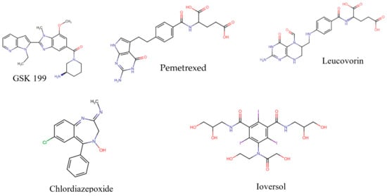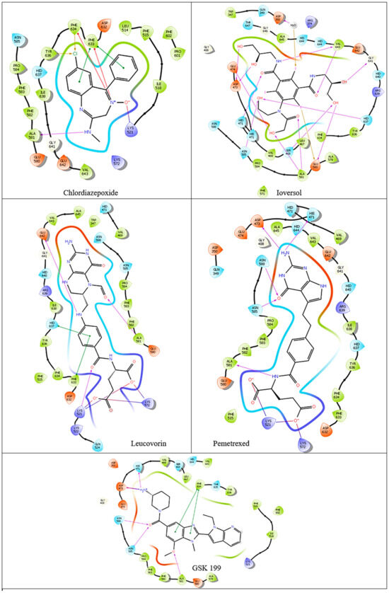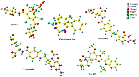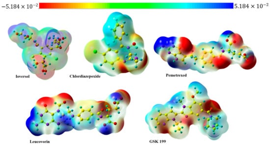 The quantum chemical reactivity descriptors are a fundamental approach to scrutinizing the stability and reactivity of molecules according to Koopmans’ approximation [63]. The energy gap is a significant parameter that gives information about the stability of molecules. Overall, it is clear from Figure 10 that Chlordiazepoxide had the lowest Egap value (2.892 ev), indicating that it was the most kinetically unstable among the potential drugs, which might be due to the seven-membered ring. Meanwhile, the Egap values of four selected drugs were generally close together. The Egap tendency increases in the following order: Chlordiazepoxide < GSK199 < Pemetrexed < Ioversol < Leucovorin. On the other hand, global hardness and softness are vital criteria for estimating a compound’s reactivity and correlate to the Egap. A decline in hardness and a rising softness value indicates a lower energy gap and unstable compounds that are more likely to undergo a reaction. Table 5 shows that Chlordiazepoxide has the lowest hardness and the highest softness value. It was more reactive (unstable) compared to the other selected drugs. In contrast, Leucovorin was the most stable drug, containing a high hardness value and lower softness. At the same time, the GSK199, Pemetrexed, and Ioversol showed moderate reactivity compared to Chlordiazepoxide and Leucovorin. In addition, electronegativity is another helpful parameter that demonstrates the ability of atoms to attract electrons to itself in the chemical bonds in the molecule; the order of the calculated results is as follows, arranged in the growing trends of electronegativity values: Leucovorin < Pemetrexed < GSK199 < Chlordiazepoxide < Ioversol. Moreover, electrophilicity investigates compounds’ capability to accept electrons. The electrophilicity index order was diminishing in the rate from Leucovorin > Ioversol > Pemetrexed > GSK199 > Chlordiazepoxide. It was apparent that Ioversol, Pemetrexed, and GSK199 tend to accept electrons from the environment less than Leucovorin and more than Chlordiazepoxide.