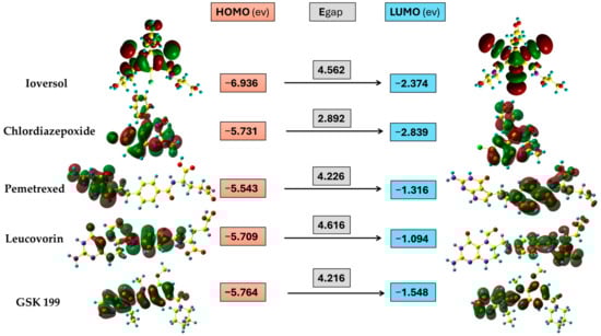 FMO is an essential tool obtained from the DFT quantum calculation method. It describes the energy of the highest orbital consisting of electrons (EHOMO) and the energy of the lowest empty orbital level (ELUMO). These energy levels determine a molecule’s reactivity and provide substantial evidence regarding its stability. As shown in Figure 10, the HOMO orbital of Ioversol is distributed at the whole molecule except the iodo derivative with side chains of terminals hydroxyl groups. In contrast, the LUMO is attributed to the triiodo phenyl derivatives with amide groups. In addition, the HOMO and LUMO of Chlordiazepoxide were lying around the whole drug except for the hydrogen of phenyl groups and LUMO of p-chloro phenyl derivative. Furthermore, the HOMO of Pemetrexed is mainly distributed on 2-amino-3,7-dihydro-4H-pyrrolo[2,3-d] pyrimidine-4-one as the donor group, while the LUMO orbital is found on the acceptor group of the carboxylic chain. Moreover, the HOMO orbital of Leucovorin is mainly located from the formyl piperazine derivative reaching central 4-aminobenzamide moiety. Meanwhile, the LUMO was almost like the LUMO of Pemetrexed. Additionally, the HOMO and LUMO orbitals of GSK199 were in the nearly identical region located from the center of the Benzimidazole scaffold to the pyrrolo[2,3-b] pyridine terminal.