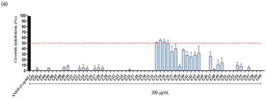 Among the 60 HPLC fractions tested (G01–G60), fractions G33, G34, G35, and G36 inhibited the growth of promastigotes L. (L.) amazonensis by 51%, 55.3%, 52.5%, and 50.3%, respectively, at a concentration of 200 μg/mL (Figure 6a). The IC50 values for these fractions, calculated over a range of 200 to 25 μg/mL, were 180.2 μg/mL, 175.2 μg/mL, 194.8 μg/mL, and 183.8 μg/mL, respectively. Four other fractions, G37, G38, G40, and G44, showed lower inhibition (30–40%) at the same concentrations for these protozoans. Fractions G41, G42, G43, and G47 inhibited parasite growth by about 20% at 200 μg/mL, while the remaining fractions showed minimal or no inhibition. The death control used in the anti-Leishmania bioassays, Amphotericin B, was able to inhibit 100% at 3 μg/mL.