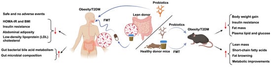 Therapeutic strategies implemented in both mouse models and clinical trials. This schematic diagram illustrates the potential metabolic benefits of fecal microbiota transplantation (FMT) and probiotics in individuals with obesity and type 2 diabetes (T2DM). It depicts the process of gut microbiota transfer from lean donors to both human and mouse models to investigate microbiome-mediated metabolic improvements. ↑, upregulated; ↓, downregulated; diagram created with BioRender.com (accessed on 26 February 2025).