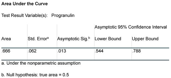 The serum progranulin levels showed a very good predictive value for the presence of autonomic neuropathy with an AUC of 0.666, and p = 0.013 (Figure 1 and Figure 2).