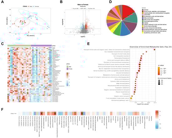 Sex difference in circulating metabolite signatures between male and female patients with atrial fibrillation. (A) OPLS-DA analysis of samples from male patients and female patients. (B) Volcano plot of all differential metabolites between male patients and female patients. (C) Heatmap of annotated differential metabolites between male patients and female patients. (D) Metabolite set enrichment of annotated differential metabolites. (E) Pathway enrichment of annotated differential metabolites based on RaMP-DB. (F) Correlation between annotated differential metabolites and anterior and posterior diameter of left atrium (LA-ap). *, p < 0.05.