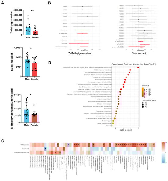 Sex-specific metabolites involved structural remodeling of left atrium during atrial fibrillation. (A) Levels of three sex-specific metabolites, 7-Methylguanosine, succinic acid, and N-Undecylbenzenesulfonic acid, in male and female patients with atrial fibrillation. (B) Forest plot of causality of metabolites 7-Methylguanosine and succinic acid on atrial fibrillation. (C) Heatmap of correlation between selected metabolites and other annotated differential metabolites. (D) Pathway enrichment of metabolites related to 7-Methylguanosine based on RaMP-DB. *, p < 0.05; **, p < 0.01.