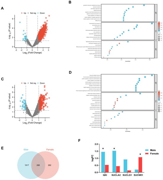 Sex differences in transcriptomic signature of left atrium and expression of genes related to sex-specific metabolites. (A) Volcano plot of gene expressions for left atrium in male patients with screening criteria of |log2 FC|≥ 1 and p value < 0.05 for different expression genes (DEGs) between atrial fibrillation (AF) group and sinus rhythm (SR) group. (B) Gene Ontology pathway enrichment of DEGs in male patients. (C) Volcano plot of gene expressions for left atrium in female patients with screening criteria of |log2 FC|≥ 1 and p value < 0.05 for DEGs between AF group and SR group. (D) Gene Ontology pathway enrichment of DEGs in female patients. (E) DEGs of left atrium in male patients between AF and SR group intersect with DEGs of left atrium in female patients. (F) Fold change in expression of genes related to selected metabolites in male and female patients between AF and SR group, separately. *, p < 0.05.