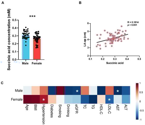 Considering the results of the correlation and mGWAS analysis, the plasma level of succinic acid was evaluated in an additional 74 patients with AF. The clinical characteristics of the 74 patients, including 35 male patients and 39 female patients, are summarized in Table A2. Consistently, the plasma concentration of succinic acid was higher in male patients with AF than that in female patients (0.31 ± 0.05 mM vs. 0.27 ± 0.05 mM; p < 0.001) (Figure 4A). And, importantly, it was proven that the plasma concentration of succinic acid was positively correlated with the LA-ap (Figure 4B). Further investigation showed that the plasma levels of succinic acid were associated with different clinical characteristics between sexes (Figure 4C). In male patients, a lower estimated glomerular filtration rate (eGFR) (r = −0.40; p = 0.020) and aspartate aminotransferase (AST) levels (r = −0.40; p = 0.017) were related to elevated levels of succinic acid. Meanwhile, in female patients, hypertension (r = 0.33; p = 0.043) and lower levels of low-density lipoprotein cholesterol (LDL-C) (r = −0.32; p = 0.048) were associated with increased levels of succinic acid.