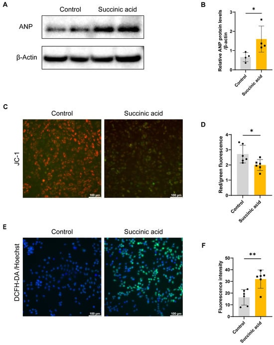 Succinic acid-induced cardiomyocyte hypertrophy and mitochondrial dysfunction. (A, B) Expression of hypertrophy marker ANP was assessed by Western blot in H9C2 cardiomyocytes treated with succinic acid and control group (n = 4). (C, D) JC-1 staining images and quantification results of H9C2 cardiomyocytes treated with succinic acid and control group (n = 6). The red fluorescence represents JC-1 aggregates and the green fluorescence represents JC-1 monomer. (E, F) ROS staining images and quantification results of H9C2 cardiomyocytes treated with succinic acid and control group (n = 6). *, p < 0.05; **, p < 0.01.