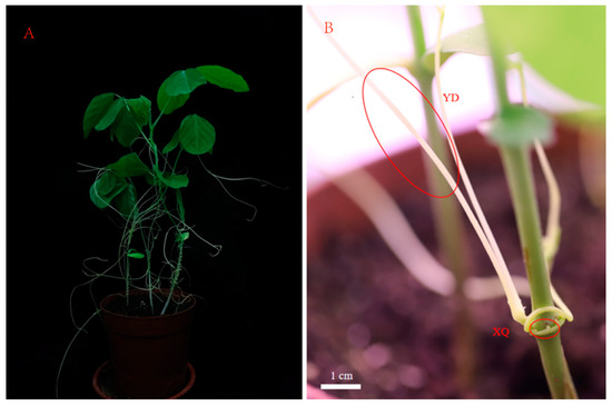 The phenotype and overall characteristics of C. australis parasitizing G. max. (A) An overview of C. australis parasitizing G. max. (B) A detailed view of C. australis parasitizing G. max. XQ is a close-up of the haustoria of C. australis, and YD is the distal stem segment of C. australis.