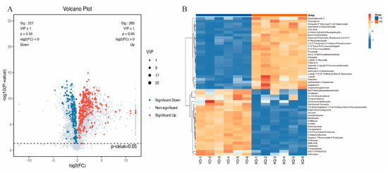 Analysis of differential metabolites in cumulators and stem segments of C. australis. (A) Volcano map VIP > 1 & p-value < 0.05 (B) cluster heatmap.