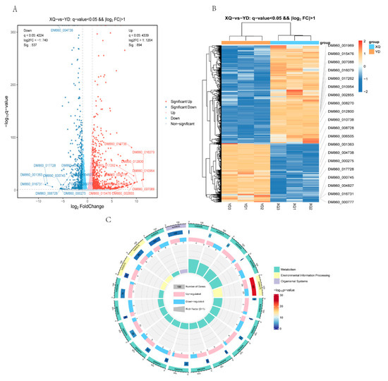 Screening and analysis of XQ and YD differential genes in C. australis. (A) Differentially expressed volcano diagram; (B) clustering diagram of differential gene grouping; (C) circle plot of differentially expressed genes and all genes in KEGG enrichment analysis.
