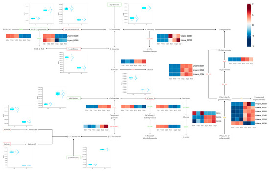 Transcriptome and metabolome analysis showed that the contents of citric acid, L-arabinose, proline, D-glucuronic acid-1-phosphate and S-methyl-5′-thioadenosine were higher in the sucker fraction, while the contents of p-coumaroyl-spermine, feruloyl-spermine, inositol, β-D-glucose, UDP-D-glucuronic acid, and L-muramic acid were higher in the distal fraction (Figure 4). The expression of UDP-D-glucuronic acid in the sucker was downregulated, which may be regulated by the UGE1 gene, and the high expression at the distal end may promote the accumulation of metabolites (Figure 5). We also conducted a correlation analysis between the differentially expressed genes and differential metabolites in the dodder (Figure S2).
