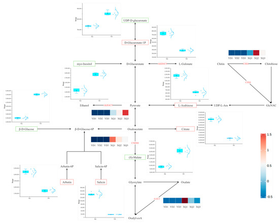 After an in-depth comparative analysis of the genomes of C. australis and G. max, we found that 163 genes may be transferred from G. max to the sucker part of C. australis through horizontal gene transfer (HGT), a process that may lead to significant upregulation of the expression levels of these genes in the sucker. To further elucidate the relationship between the differential metabolites and differentially expressed genes between the inhaler and the distal diameter segment, we constructed a co-expression network of carbohydrates, amino acid metabolites, and the related genes, as shown in Figure 7 and Figure 8. Most of the differentially expressed genes in the sucker and distal diameter segments were upregulated in the sucker. The expression of differentially differentiated genes such as arginine decarboxylase (ADC), aspartate synthetase 1 (AS1), malate dehydrogenase (CMDH), phytoaldehyde ketone reductase (AKR4C9), and S-adenosylmethionine decarboxylase (SAMDC) in the sucker was significantly higher than that in the distal diameter segment. In the pipette part of dodder seeds, citric acid (Citrate), L-arabinose (L-arabinose), proline (Proline), D-glucuronate-1-phosphate (D-Glucuronate-1P), and S-Methyl-5′-thioadenosine were significantly higher than those in the distal fraction. In particular, the upregulation of S-methyl-5′-thiopadenosine expression may be regulated by SAMDC, S-adenosylmethionine synthetase (SAMS), and MS1 genes, and the high expression of these genes in the sucker may promote the accumulation of the corresponding metabolites. In contrast, in the distal part of dodder seeds, p-coumaroyl-agmatine, feruloyl-agmatine, (S)-Malate (S-malic acid), inositol (Myo-Inositol), the contents of β-D-glucose, β-D-glucose, uridine diphosphate-D-glucuronate, and L-muramic acid were higher than those in the pipeline. The upregulation of the expression of (S)-Malate may be regulated by the malate dehydrogenase (CMDH) gene, and the high expression in the sucker leads to the higher (S)-Malate in the distal diameter segment than in the aspirator, which is reflected by the box plot, which shows the comparison of their content in the aspirator and the distal diameter segment.
