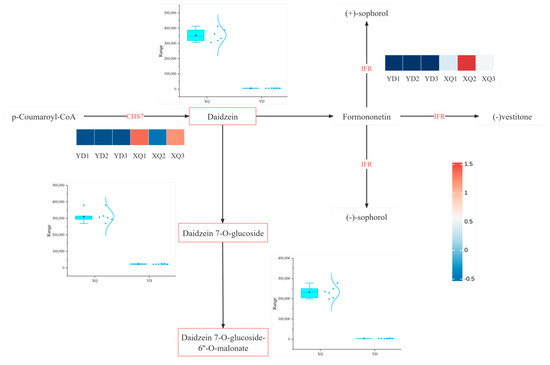 Chalcones synthase (CHS) is one of the key enzymes in the secondary metabolic pathway of plants, which catalyzes the synthesis of chalcones, which are the first steps in the synthesis of flavonoid compounds, including isoflavones. CHS forms chalcones by polymerizing three molecules of malonyl-CoA (malonyl-CoA) and one molecule of shikimic acid (p-Coumaroyl-CoA). Daidzein is a major isoflavone found mainly in G. max [38]. In an article investigating the biosynthesis of 5-deoxy isoflavones (e.g., genistein and its conjugates) in G. max [39], it was found that CHS plays a key role in the initial step in the biosynthesis of daidzein, i.e., the generation of chalcone. Chalcone is then catalyzed by CHR and other enzymes to produce daidzein. As can be seen in the figure, the content of the metabolite, daidzein, in the sucker part is higher, and since the content of CHS in the sucker part of C. australis is higher than that of the distal end, we surmise that it may be due to the increase in the content of daidzein in the gene CHS absorbed by the dodder from the host G. max, which leads to the increase in the daidzein content. However, it is also possible that the metabolite content is elevated due to the direct absorption of some metabolites by the pipette. Isoflavone reductase (IFR) is involved in the final step of the biosynthesis of various isoflavones in daidzein [40].