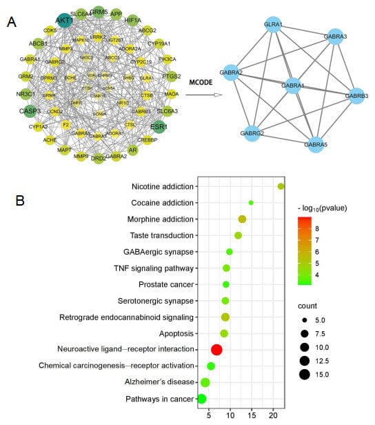 In short, we imported the intersection targets of ATS and epilepsy into a String database to obtain the interaction relationships between target proteins, and used Cytoscape software 3.9.1 to draw a protein–protein interaction network (PPI). Further analysis of sub network modules was conducted using the MCODE plugin in Cytoscape software 3.9.1 to screen for key genes involved in the antiepileptic effects of ATS, including gamma aminobutyric acid type A receptor genes (GABRA1, GABRA2, GABRA3, and GABRA5), gamma aminobutyric acid type A receptor beta 3 subunit (GABRB3), gamma aminobutyric acid type A receptor gamma 2 subunit (GABRG2), and glycine receptor alpha 1 subunit (GLRA1) (Figure 1A). On the other hand, KEGG analysis revealed pathways such as the neuroactive ligand–receptor interaction and GABAergic synapse (Figure 1B).