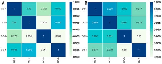 Plasma metabolomic profiles were generated using UPLC–MS analysis in both negative and positive ion modes. To ensure accuracy and stability, one QC sample was analyzed for every six samples due to the susceptibility of metabolism to external influences and its rapid fluctuations. Additionally, Pearson correlation coefficients were computed for the QC samples based on the relative quantitative values of metabolites. A correlation coefficient close to 1 indicates superior overall test stability and higher data quality []. In this study, the correlation coefficient approached 1 in both negative and positive ion modes, indicative of good data stability and high quality, thereby providing reliable results (Figure 2).