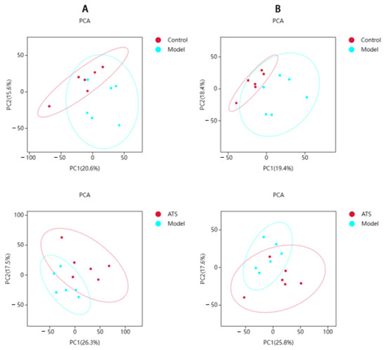 PCA score plots in different ion modes. (A) Positive PCA score plots and (B) negative PCA score plots.