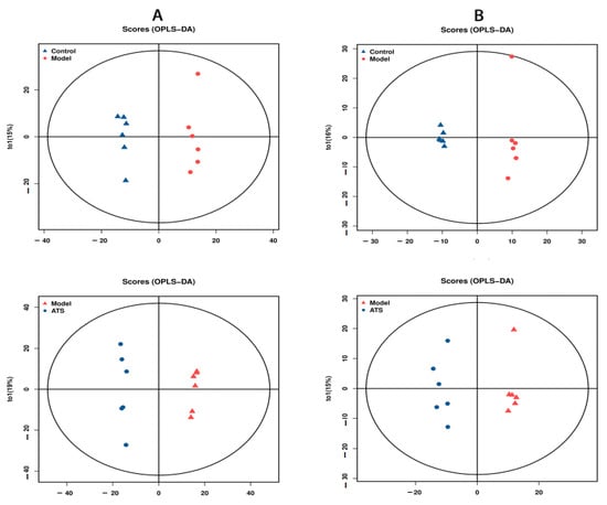 OPLS-DA score plots in different ion modes. (A) Positive OPLS-DA score plots and (B) negative OPLS-DA score plots.