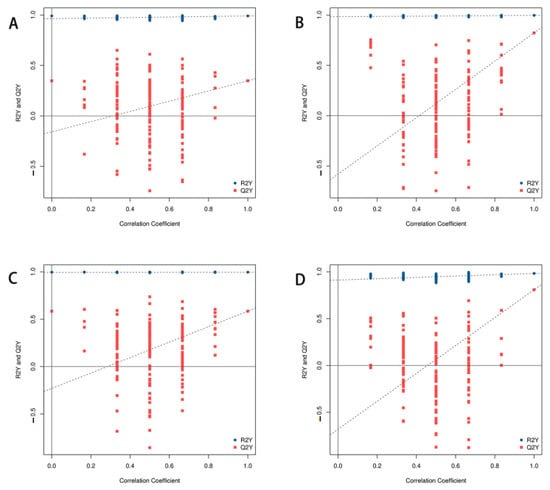 Permutation test results of OPLS-DA model. (A) Positive scatter plots for control group vs. model group; (B) positive scatter plots for model group vs. ATS group; (C) negative scatter plots for control group vs. model group; and (D) negative scatter plots for model group vs. ATS group.