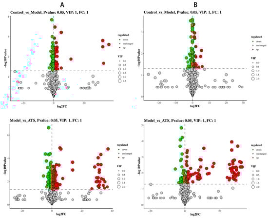 Volcano plots of differential metabolites in the OPLS-DA model. (A) Positive volcano plot and (B) negative volcano plot.