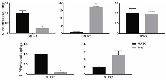 S1P receptor expression in HUVEC and 143B cells. Real-time PCR analysis of the indicated genes normalized to three housekeeping genes (GAPDH, GUSB, and YWAHZ) in 143B and HUVEC cells cultured as monolayers for 72 h. Data presented as mean ± S.E.M. Unpaired two-tailed Mann–Whitney U test (* p < 0.05 and ** p < 0.01 versus HUVEC; n = 3).