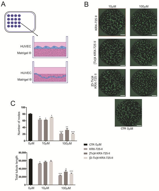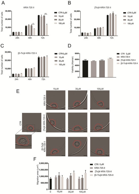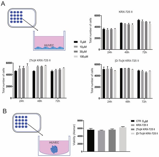 HUVEC cells were seeded in 96-well, flat-bottom tissue culture plates and coated with 0.2% gelatin. After seeding, cells were treated with 10 μM, 30 μM, or 100 μM of KRX-725-II, Tic-4-KRX-725-II, and [D-Tic]4-KRX-725-II, and cell growth was assessed up to 72 h after drug exposure. To obtain the total number, cells were stained in complete cell medium with Hoechst 33,342 2.25 μg/mL for 20 min. Images were acquired by fluorescent microscopy using the ImageXpress Pico Automated Cell Imaging System (Molecular Device, San Jose, CA, USA) with a 4× objective. Analysis software detected the total number of cells based on Hoechst-positive nuclei.