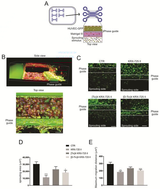 Three-lane Mimetas® microchambers were used for HUVEC vessel formation; cells were then seeded in the upper channel and Matrigel® in the middle channel; vessels were allowed to form. After 24 h, vessel formation was assessed by GFP fluorescence on live cells with confocal microscopy, and an angiogenic cocktail formed of 250 nM S1P and 37.5 ng/mL of VEGF was added in the lower channel; 100 μM of pepducins were added in the top channel. To simulate physiological perfusion flow, the microfluidic device was placed on a rocking plate: the rocker was set to change the tilting angle every 8 min. Furthermore, 24 h after drug treatment, vessels were live imaged with GFP fluorescence.