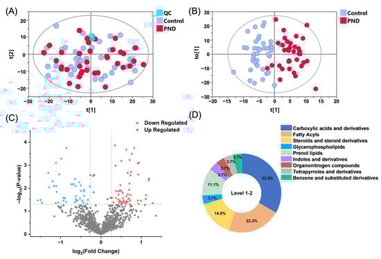 Differential fecal metabolomic signatures between PND and control cohorts. (A) PCA and (B) OPLS-DA score plots derived from combined RPLC/HILIC-TOF MS analyses in both positive and negative ESI modes. Symbolic representation: PND group (red), controls (blue), and QC samples (cyan). (C) A volcano plot illustrates metabolite dysregulation, with up-regulated metabolites shown in red, down-regulated metabolites in blue, and nonsignificant changes in gray. (D) Distribution of metabolites across different classes.