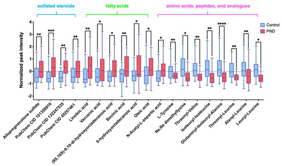 Box plot shows differences between the PND and control groups of four sulfated steroids- Allopregnanolone sulfate, [(3S,8R,9S,10R,13S,14S,17S)-17-acetyl-6-hydroxy-10,13-dimethyl-2,3,4,5,6,7,8,9,11,12,14,15,16,17-tetradecahydro-1H-cyclopenta[a]phenanthren-3-yl] hydrogen sulfate (PubChem CID 101359910), methyl (1S,2S,4bS,7R,8aR)-1,2,4b-trimethyl-7-sulfooxy-1,3,4,4a,5,6,7,8,8a,9,10,10a-dodecahydrophenanthrene-2-carboxylate (PubChem CID 132247535) and [(3R,5S,8R,9S,10S,13S,14S,17R)-17-hydroxy-17-(2-hydroxyacetyl)-10,13-dimethyl-1,2,3,4,5,6,7,8,9,11,12,14,15,16-tetradecahydrocyclopenta[a]phenanthren-3-yl] hydrogen sulfate (PubChem CID 45257461), six fatty acyls-linoleic acid, vaccenic acid, (9S,10S)-9,10-dihydroxyoctadecanoic acid, bovinic acid, 9-hydroxyoctadecanoic acid, and oleic acid), and nine amino acids, peptides, and analogues-L-tyrosine, Ne,Ne dimethyllysine, N-acetyl-L-aspartic acid, threonyl-valine, isoleucyl-isoleucine, glutaminyl-isoleucyl-alanine, threonyl-leucine, alanyl-leucine, and leucyl-leucine). *, 0.01 < p ≤ 0.05; **, 0.001 < p ≤ 0.01; ***, 0.0001< p ≤ 0.001, ****, p < 0.0001.