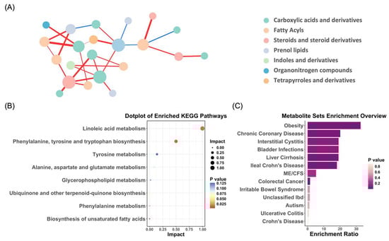 Integrated analysis of differential metabolite network, KEGG pathway enrichment, and disease associations. (A) Debiased sparse partial correlation network analysis demonstrating the differential relationships between significantly altered metabolites. Each node represents a metabolite, with its size indicating betweenness centrality, which reflects how often a metabolite appears on the shortest paths between others. The edges represent the strength of partial correlations between metabolites after adjusting for all other variables in the dataset. Red edges indicate positive correlations, while blue edges represent negative correlations. (B) KEGG pathway analysis highlighting the significantly altered metabolites in PND. (C) Association of PND-related metabolites with human disease states, based on existing metabolomics data.