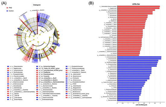 Gut microbiota differential analysis. (A) Differences in gut microbiota composition from the phylum to genus levels between the PND and control groups. (B) LDA discriminant analysis results. Note: In (A), nodes in different colors represent microbial taxa that are significantly enriched in their respective groups and contribute substantially to inter-group differences. Yellow nodes indicate taxa that show no significant difference between groups or have minimal influence on the observed variations. In (B), the LDA effect size histogram highlights microbial taxa with significant effects in both groups. The LDA score derived from this analysis indicates that a higher LDA score reflects a greater contribution of species abundance to the observed differences.