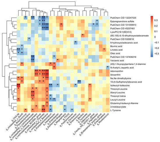 A linear discriminant analysis effect size (LEfSe) was applied to investigate differences across all classification levels. The relationship between fecal metabolites and gut microbiota was evaluated using R (pheatmap package), with Spearman’s correlation coefficients quantifying the strength of these associations. The results were presented as heatmaps, with color gradients indicating the strength of the correlations between fecal metabolites and gut microbiota.