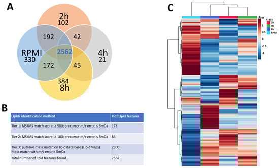 A total of 2562 compounds were annotated for the LC-MS analyses of the RPMI (time 0 h) and time point samples (2 h, 4 h and 8 h). From the three-tier ID approach, 178 lipids were annotated by MS/MS spectral match in Tier 1 (MS/MS similarity score ≥ 500 and precursor m/z error ≤ 5.0 mDa), while 84 lipids were annotated in Tier 2 (MS/MS similarity score between 500 and 100 with precursor m/z error ≤ 5.0 mDa), totalizing 262 MS/MS-annotated compounds (Supplementary Table S2). In addition, 2300 lipids were annotated with lower confidence in Tier 3 (mass-match with m/z tolerance of 5.0 mDa) (Figure 1A,B). This global set of lipid features was arranged in a hierarchical heat map for all the samples subjected to lipidomics (Figure 1C). Several clusters of lipids displayed significantly elevated or decreased intensities for each time point.