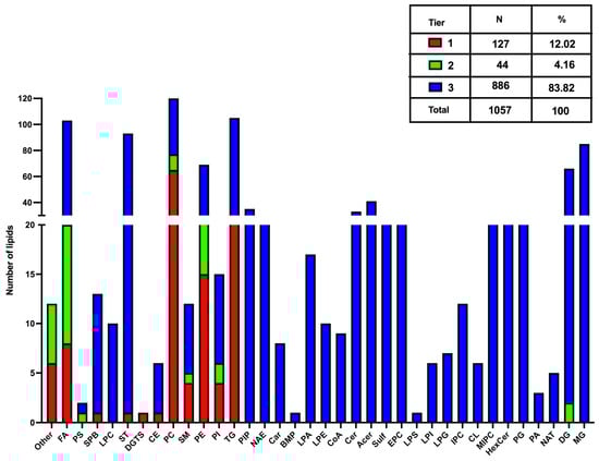 Figure 2. Distribution of 1057 lipids detected and annotated from H. contortus culture medium supernatants following subtraction of blank (media without worms, RPMI or 0 h) and quality control replicates (12 of them were categorized as “Other”, corresponding to compounds that are not classified as lipids). Compounds annotated in tier 1 have MS/MS spectral match with similarity score ≥ 500, while tier 2 have scores between 100 and 500. Tier 3 annotations are solely based on m/z match. All annotations passed a 6-tier filtering and scoring approach to handle isomeric and isobaric matches. The lipidome found in H. contortus culture supernatants contains several lipid sub-classes, including Fatty acids and conjugates (FAs); Phosphatidylserines (PSs); Sphingoid base-phosphates (SPBs); Lysophosphatidylcholines (LPCs); Sterols (STs); Diacylglyceryltrimethylhomoserines (DGTSs); Cholesteryl esters (CEs); Phosphatidylcholines (PCs); Sphingomyelins (SMs); Phosphatidylethanolamines (PEs); Phosphatidylinositols (PIs); Triacylglycerols (TGs); Phosphatidylinositol-phosphates (PIPs); N-acyl ethanolamines (endocannabinoids) (NAEs); Fatty acyl carnitines (Cars); Bis(monoacylglycero)phosphates (BMPs); Lysophosphatidic acids (LPAs); Lysophosphatidylethanolamines (LPEs); Acyl coenzyme A’s (CoA); Ceramides or ceramide phosphates (Cers); Acylceramides (Acers); Sulfoglycosphingolipids (sulfatides) (Sulfs); Ceramide phosphoethanolamines (EPCs); Lysophosphatidylserines (LPSs); Lysophosphatidylinositols (LPIs); Lysophosphatidylgylcerols (LPGs); Ceramide phosphoinositols (IPCs)Cardiolipins (CLs); Mannosyl-Ceramide phosphoinositols (MIPCs); Hexosylceramides (HexCers); Phosphatidylglycerols (PGs); Phosphatidic acids (PAs); N-acyl amine taurines (NATs); Diacylglycerols (DGs); Monoacylglycerols (MGs).