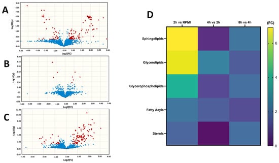 Figure 3. Univariate analysis based on Volcano plots (significance criteria: FC ≥ 1.5 or ≤0.67 and p-value adjusted for false-discovery rates-FDR < 0.05) for media collected from Haemonchus contortus cultures at different time points. (A) 2 h vs. RPMI media (time 0), showing 258 significantly altered lipids; (B) 4 h vs. 2 h, showing 8 significantly altered lipids; (C) 8 h vs. 4 h, with 126 significantly altered lipid features. In (AC), red dots indicate number of significant lipids altered per time point. (D) Matrix comparing the overall means of significantly altered lipid species annotated within each lipid category.