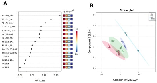 We looked more closely at the lipid profile found throughout all time points with the most significant Variable Importance in the Prediction (VIP) for the PLS-DA model. Figure 4A shows the lipids with the highest VIP values, mainly PC and one NAE, HexCer, Sulf, and PE subclasses.