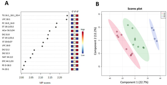 Figure 4. Multivariate statistics using PLS-DA for media collected from H. contortus culture at different time points, including 0 h (RPMI), 2 h, 4 h, and 8 h. (A) Fifteen most important lipids for the PLS-DA model. The side panel shows a heatmap of peak intensity ratios for these lipids, where red squares correspond to the highest intensities and blue squares, the lowest abundances. (B) PLS-DA scores plot (leave-one-out cross-validation R2 of 0.993 and Q2 of 0.832; permutation test with a p-value of 0.039 for 1000 permutations), showing the separation between the excretory-secretory lipid products at different time points, i.e., 0 h (RPMI in cyan), 2 h (in red), 4 h (green) and 8 h (blue).