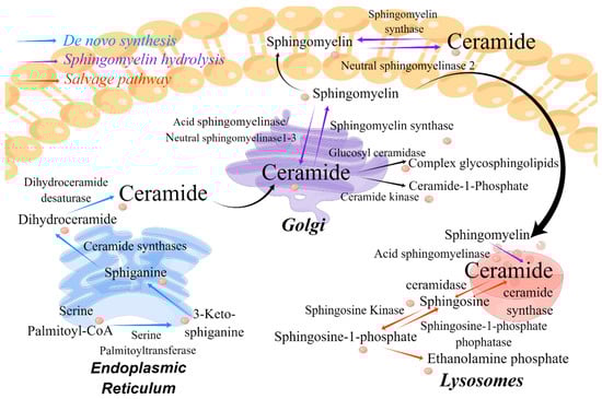 Ceramide is produced through three typical pathways: de novo synthesis, salvage synthesis, and the SM hydrolysis pathway, as shown in Figure 2.