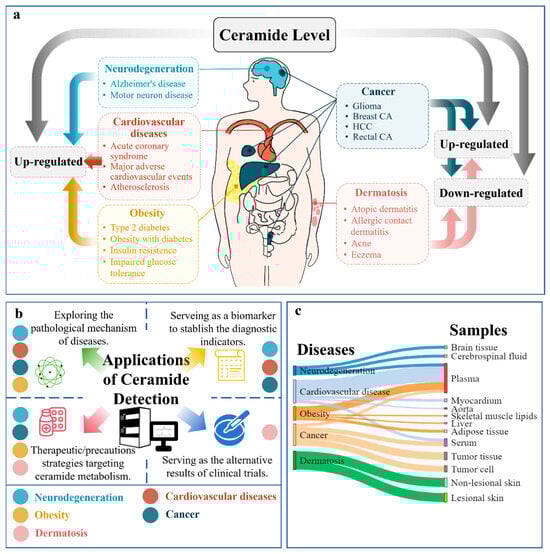 (a) Relationships between ceramide and clinical diseases; (b) Applications of ceramide detection; (c) Ceramide samples of the diseases.
