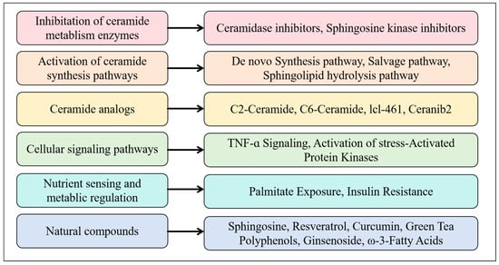 Ceramides have attracted widespread research attention as potential tumor suppressor drugs. Currently, tumor-targeting drugs focus on regulating ceramide levels in cancer cells [7]. Figure 4 presents these approaches.