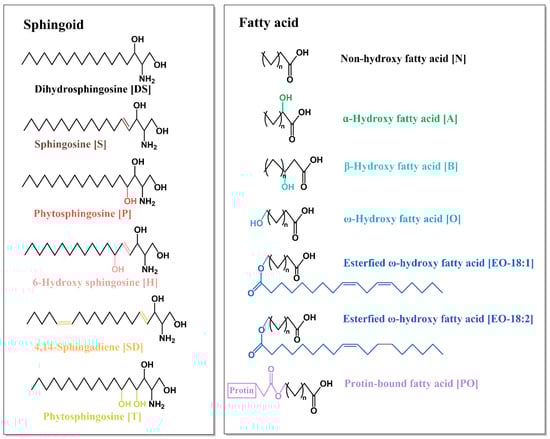 Currently, two nomenclature systems are commonly used for ceramides in dermatology. The first method is based on the order of chromatographic migration, naming ceramides 1–8 in sequence, with ceramides 9–11 named according to the chronological order of their discovery. In the second method, ceramides are classified based on their molecular structure, and each ceramide is designated using abbreviations that represent the structure of the LCB and FA, as shown in Figure 5. According to this method, ceramides are divided into 25 classes, with letters representing the acyl chain: [N] (nonhydroxy), [A] (α-hydroxy), [B] (β-hydroxy), [O] (ω-hydroxy), [EO] (esterified omega-hydroxy), and [PO] (esterified omega-hydroxy). The final letter refers to sphingosine moieties, such as [S] (sphingosine), [DS] (dihydrosphingosine), [P] (phytosphingosine), [H] (6-hydroxy-sphingosine), and [SD] (4,14-sphingosine) [56], as listed in Table 4 [55]. In mammals, the most abundant ceramides are composed of sphingosine and nonhydroxylated FAs and are known as CER[NS]. Both CER[NS] and CER[NDS] are present in almost all mammalian tissues, whereas other ceramides are found only in specific tissues [55]. Previously, the human skin stratum corneum was believed to contain only 16 ceramide subtypes, excluding those containing [SD], [B], and [PO], with 12 being free-extractable subtypes and 4 being ω-hydroxylated sphingosines (i.e., CER[ODS], CER[OS], CER[OP], and CER[OH]) bound to the cellular cuticle, making them difficult to extract and measure. In addition, the low content of CER[EODS] made it challenging to measure. Thus, earlier studies have typically reported data on only 11 ceramide subtypes [56]. Ceramides containing β-hydroxy FAs have been found in mouse epidermis but not in human skin [57]. Furthermore, some EO ceramides are converted into protein-bound ω-hydroxy ceramides (P-O ceramides), which are linked to crosslinked proteins in the keratinized envelope. Damage to EO or P-O ceramides can lead to ichthyosis [55]. Recently, the number of ceramide subclasses in the stratum corneum of the human skin has expanded to 21, including SD ceramides, which contain a 4,14-sphingodienyl base and were first identified in the human skin [55]. With advancements in analytical techniques and more sensitive methods, additional ceramide bases can be discovered, such as the recently identified 1-O-acyl ceramide [1-O-E(EO)Cer] in EpiSkin, a human reconstructed epidermal model [58]. Characterizing the fine structure of ceramide biomarkers is essential for tracking and studying metabolic pathways, and developing new assays to study lipid biosynthesis and lipids in the stratum corneum can explain the impaired barrier function of the skin caused by disruptions in these pathways [58].