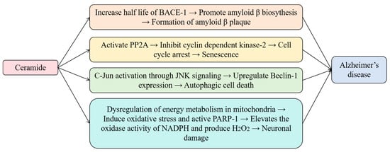 Metabolic dysregulation is associated with the development and progression of early neurodegenerative diseases, including AD [70]. Lipids are highly abundant in the brain, constituting >50% of its dry weight [71], and play a crucial role in both physiological and pathological processes. Alterations in lipid metabolism are considered a key factor in AD pathogenesis [72]. Sphingolipids, in particular, are enriched in the central nervous system (CNS) [73], and they were first identified in the brain tissue. In 1884, the German physician Johann Ludwig Wilhelm Thudichum isolated a previously unknown lipid species from brain tissue. Due to its unique amphiphilic properties and unknown biological roles, he named the obtained species as sphingolipids after the mythical Sphinx of Greek legend [74]. Studies have demonstrated the abundant distribution of sphingolipids in the membranes of nerve cells and the myelin sheaths of nerve fibers [72], and sphingolipids also play a crucial role in AD pathogenesis. In the CNS, ceramide, a key bioactive lipid within the sphingolipid family, is synthesized in the endoplasmic reticulum of neurons and glial cells [73]. Ceramide levels both in cells and plasma significantly affect several pathological features of AD, including amyloid-beta (Aβ) plaques, mitochondrial dysfunction, cellular senescence, autophagy dysfunction, platelet activation, and endothelial dysfunction [73]. The mechanistic role of ceramide in the pathogenesis of AD shown in Figure 6 [69].