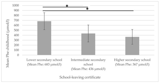 Mean Phe childhood in relation to educational attainment. Phe = phenylalanine concentrations in dried blood. * significantly different.