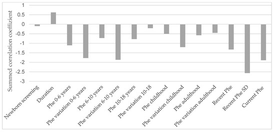 Influence of metabolic control in each life stage on the correlation sum score of the executive functions. Phe = phenylalanine concentrations in dried blood; SD = standard deviation. The underlying dataset is available in the Supplementary Materials (Table S1).